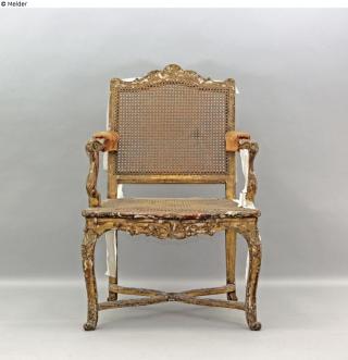 Inventarbuch-Eintrag 3.9.1952: Rokoko-Lehnsessel mit Rohrgeflecht Holzrahmen vergoldet, stark abgeblättert. Obere Lehnenkante, vordere Stuhlkante u. Füsse geschweift. Rahmen mit flacher Holzschnitzerei verziert. Rückseite gepunzt. Beine durch geschwungene flach geschnitzte Stäbe verbunden in der Mitte Rosette. Armlehnen neu gepolstert.