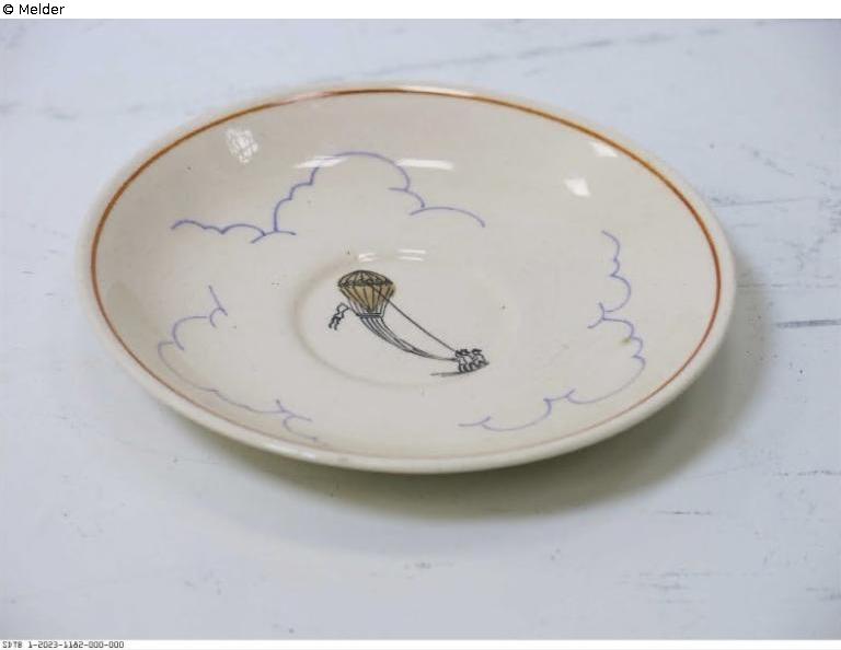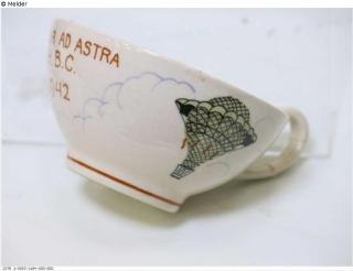 1/2023/1179 Aschenbecher mit Ballonmotiv, Aufschrift Haagsche Ballonclub 1936-1941, auf der Unterseite Aufschrift des Herstellers 240 Koninklyk Goedewaagen, Gouda; 1/2023/1180 bis 1182 Untertassen mit Ballonmotiv, auf der Unterseite Aufschrift des Herstellers Koninklijk Goedewaagen, Gouda-Holland; 1/2023/1183 Tasse mit Ballonmotiv und Aufschrift Haagsche Ballonclub Lustrum 1941, Unterseite leer; 1/2023/1184 Tasse mit Ballonmotiv und Aufschrift SIC ITUR AD ASTRA H.B.C. 1942, Unterseite leer.