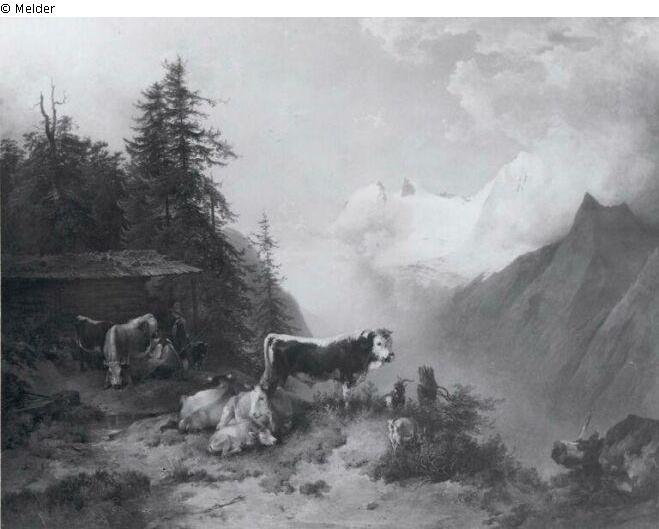 Fundmeldung | Einzelobjekt Alm mit Kühen und Stier Lost Art-ID565792 Vorherige Weiter Hersteller/Künstler:in Gauermann, Friedrich Geburt 1807.09.20, Miesenbach (Wiener-Neustadt) Tod 1862.07.07, Wien WirkungsortWien TitelAlm mit Kühen und Stier Datierung1833ObjektartGemäldeObjektgruppeMalereiMaterial / TechnikÖl / gemalt Höhe 75,50 cm Breite 95,00 cm Inventarnummermü9382Beschreibung Signatur: F.Gauermann 1833; In Mitte Stier nach rechts im Profil. Davor liegende Kühe, rechts Ziegen. Links hinten Stall mit Kühen, von denen eine gemolken wird; daneben Bauer. Links hohe Tannen. Rechts Hochgebirge. Weiterlesen Weniger anzeigen Bestand Kulturgüter aus dem ehemaligen ReichsvermögenVeröffentlicht seit13.12.2016 Kontakt Kunstverwaltung des Bundes Herbert-Bayer-Straße 5 13086 Berlin Deutschland E-Mailprovenienzforschung@kvdb.bund.deHomepagehttp://www.kunstverwaltung.bund.de