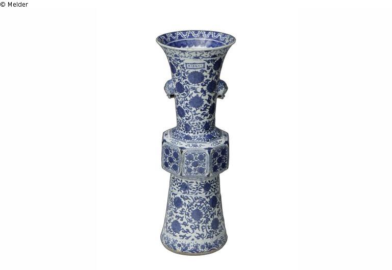 Porzellan, Blau-Weiß; Marke: "Da Ming Wanli nianzhi" (hergestellt in der Ära Wanli); Etwa in der Mitte des Halses zwei leicht grüngetönte Löwenköpfe; Stilisierte Wellen und Blüten, rankenartige Chrysanthemen, Päonienranke; Achtkantige Mittelzone, verziert mit je fünf Chrysanthemen; Schulter mit daoistischen Symbolen und den "Acht kostbaren Dingen"; Ornamentfries aus ruyi-Formen. Im Inneren Dreiecke und Blütenblätter