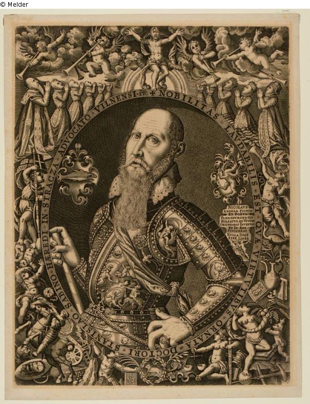Signatur (unten): NICOLAVS ANDREÆ ∙ PICTOR ET POETA FLENSBVRGENSIS HALSATVS ∙ ADVIVUM DELINEABAT ∙ INVENTOR ET IN ÆERE SCVLPEBAT │ NVLLA DIES SINE LINEA Inschrift: + NOBILITAS ∙ LAVDABILIS ∙ EST ∙ QVÆ ∙ VIRTVTIBVS ∙ ORNATA ∙ DOCTORI ∙ STANISLA ∙ SABINO ∙ HÆREDI ∙ IN ∙ STRACZSA ∙ ADVOCATO ∙ VILNENSI ∙ ETC