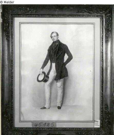 Signatur: Kriehuber 844; Der blonde und blauäugige junge Mann trägt einen blauen Rock mit Aufschlag aus schwarzem Samt. Dazu braune Samtweste und weißbraun karierte Beinkleider. Stehend nach halblinks, in der Rechten den Zylinder, auf Knie gestützt. Blick zum Beschauer.