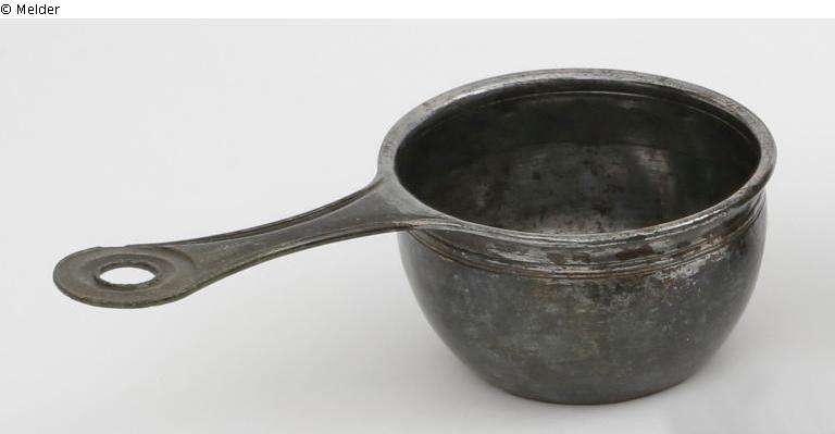 Bronzekasserolle mit Weißmetallüberzug und Herstellermarke NAEVI CE eines Fabrikanten aus Kampanien, Südwest-Italien