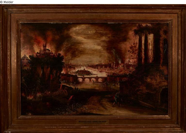 Rückseite, auf dem Keil rechts, Bleistift: Brand von Troja │ Hendrik van Ceve (?) │ Prof. Winkler, quer dazu in roter Kreide, umkreist: Co [oder Lot?] 1870. Der Vermerk „Brand von Troja │ Hendrik van Ceve │ Prof. Winkler“ verweist mit großer Sicherheit auf eine mündliche Zuschreibung des Bildes an Hendrik van Cleve durch Professor Friedrich Winkler (1888-1965), dem ehemaligen Direktor des Berliner Kupferstichkabinetts.