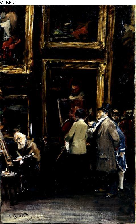 2 Künstler, die in einer Gemäldgalerie an ihrer Staffelei jeweils an ihren eigenen Werken arbeiten. Ein älterer Maler sitzend (links), einer stehend (Mitte). Dem Künstler in der Mitte schaut ein älterer Besucher mit Zylinder über die Schulter.