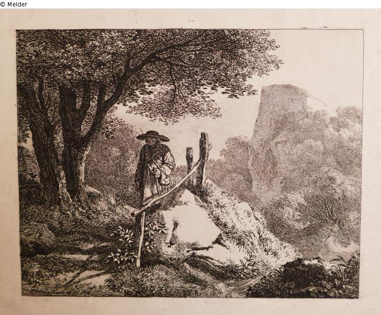 Dargestellt ist ein Wanderer mit Hut und Stock in einer felsigen Landschaft; In der Darstellung signiert, datiert unten links: J.C.Erhard inv. et fec. 1818