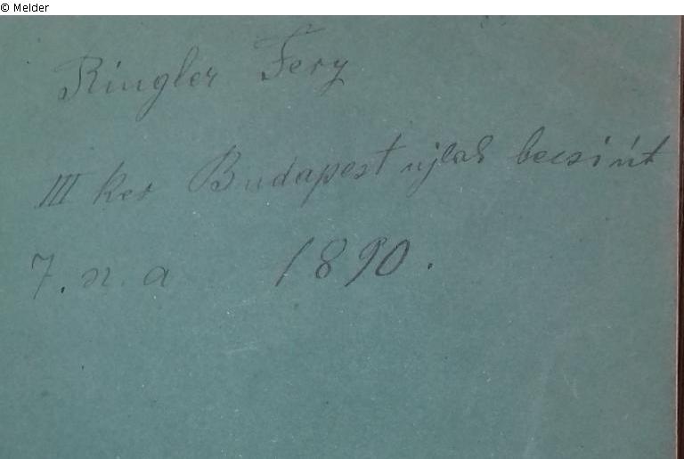 Buch; Papier, Druckerschwärze, Bindung, Leineneinband, Goldprägung. H 23 cm ; B 16 cm. Handschriftlich: "Ringler Fery III Rer Budapest...7.n.a.1890"; "Ringler, Martin Tulaidona! 1874".