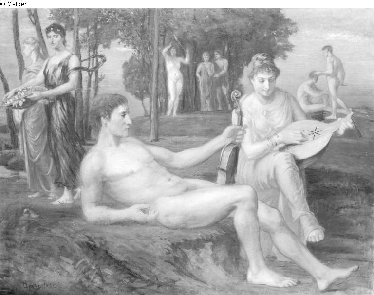 Bezeichnet unten links: "A. Lang 1892", auf dem Rückseitenschutz unten links Etikett BStGS "Inv. Nr. 12253", darunter noch mal handschriftlich in Blau "Nr. 12253", auf der Leinwand oben rechts Spuren eines abgerissenen Aufklebers, auf dem Keilrahmen oben links ein rechteckiger Aufkleber mit aufgedruckt "330", oben rechts ein weißer Aufkleber darauf handschriftlich: "Gemälde von Albert Lang 1892 / Untere Hand des Mannes an fehldenden Stellen nachgedeutet / Bild mit Dammarfirnis überzogen / Das Bild war schon einmal ... Juni 1941 / Theo Wiese", auf dem Keilrahmen links oben unleserliche Spuren einer Bleistiftbeschriftung "Ju"? und "II/2"?, links unten in Rot „PR“ (Photo Roth), darunter Etikett BStGS "Inv. 12254", auf der Mittelsenkrechten ein abgerissenes Etikett dessen kleine Papierreste einen blau gemusterten Rahmen zeigen, rechts in Blau "31 R 9/3u" (Standort Meiserstr.), rechts unten weiteres Etikett BStGS "Inv. 12254"