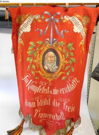 Fahne bzw. Banner, hochrechteckiges Format. In den Farben rot, weiß und grün. Aufschrift Vorderseite: "Freie Turnerschaft Münden 1897", Rückseite "Im Kampfe fest u. nie erschlafft,
