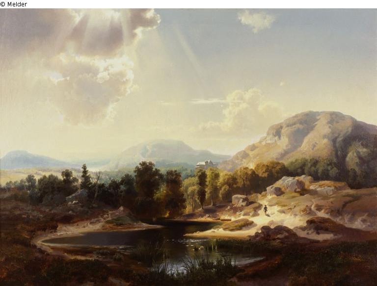 Sign./Bez.: "George Jabin", unten rechts. Rückseite: oben links über Keil- und Schmuckrahmen alter Klebezettel, teils zerstört: "Gebirgslandschaft mit ... Gewitter / gemalt von Georg Jabin / ... Preis ..."; rechts runder Stempel, nicht lesbar; Mitte: "2097/38", Mittelstrebe: angeschraubtes Schild: "Georg Jabin / (1828-1864) / Gebirgslandschaft bei heranziehendem Gewitter" (Druck), darüber runder Museumsstempel und "Nr. 757" (Blei); unten links: "neue Inventar / Nr. 95/435" (Blei), Schmuckrahmen, links: runder Museumsstempel und "757" (Blei)
