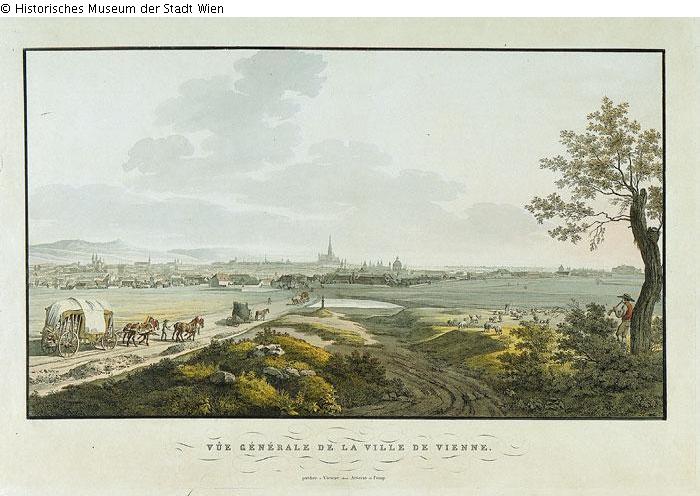 Platte Höhe: 49 cm, Breite: 73 cm; Bezeichnung unten Mitte: Vûe générale de la Ville de Vienne. / publiée à Vienne chez Artaria et Comp. Umrissradierung