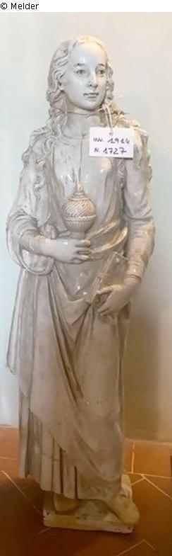 Die vollplastisch gearbeitete Standfigur zeigt die heilige Maria Magdalena, leicht nach rechts gewandt. Lange Locken fallen über die Schulter der Dargestellten. In der rechten Hand hält sie ein Salbgefäß sowie in der linken Hand ein Buch.
