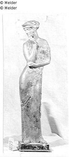 Im wollenen Gewand, Kopf nach halblinks, unten gestützt vom rechten Arm. Der Ellenbogen gestützt von der linken Hand.