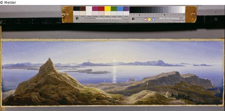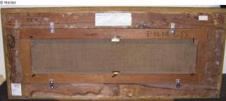 "bezeichnet mit ""Ahlborn 1832"" - Alternativer Titel: ""Ansicht von Capri"" - Auf der Rückseite des Zierrahmens (Oberschenkel) beschriftet handschriftlich in Schwarz „67,5“; Reste eines Klebe-Etiketts der Spedition Gustav Knauer, Berlin - Auf der Rückseite des Keilrahmens (Oberschenkel) beschriftet handschriftlich in Schwarz (auf dem Kopf stehend) „Ahlborn“; auf dem rechten Seitenschenkel Ziffern „2 7 / 9/4“