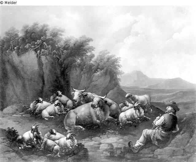 Lagernde Herde (Kühe) mit Hirt