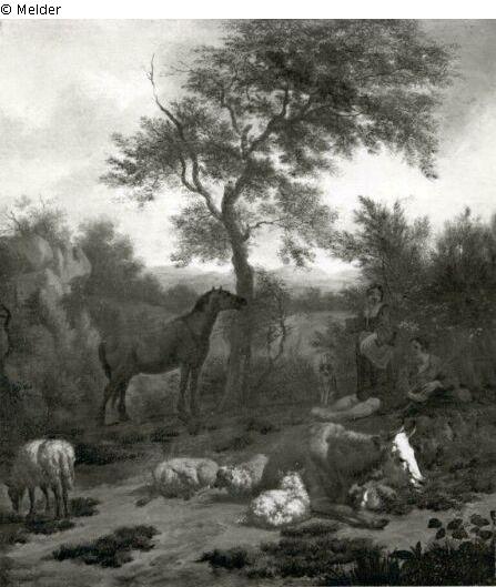 Landschaft mit Hirten, Pferd, Kuh und Schafen