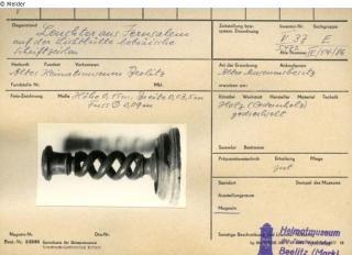 Kerzenhalter, "auf der Lichttülle mit hebräischen Schriftzeichen" [Karteikarte Beelitz, vor 1954] / "Leuchteroberteil mit gedrehtem Stiel und schwarzer Aufschrift in hebräisch und deutsch: Jerusalem, Leuchterunterteil fehlt" [Karteikarte Potsdam-Museum, 1981]