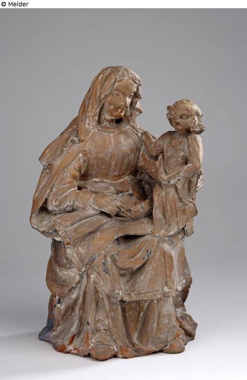 Vollplastische Gruppe aus rötlichem Ton. Auf dem linken Knie der sitzenden Maria steht der segnende Jesusknabe, den sie mit ihrer Linken stützt, während die Rechte in den auf den Schoß gelegten Mantel greift. Maria mit gegürtetem Gewand, Kopftuch und Mantel mit Fransensaum.