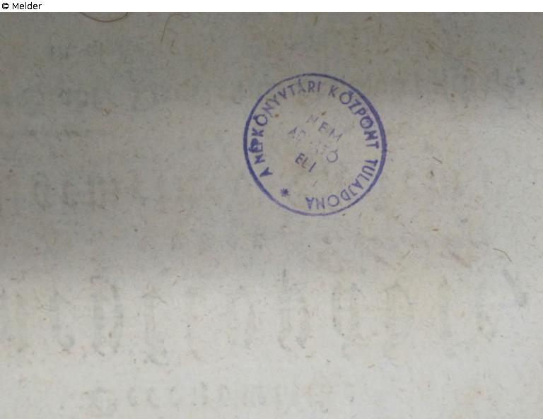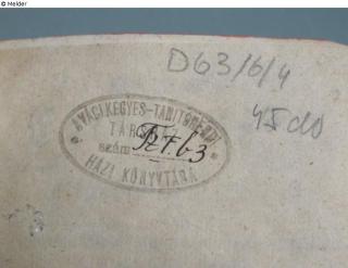 auf dem fliegenden Vorblatt mit Bleistift: D63/6/4, 45 do; auf dem Titelblatt mit Feder in Schwarz: Studii Philosophici Scholarum diarum; Stempel: auf Schmutzblatt in Braun, oval, 25 x 50 mm: A váci kegyes-Tanitórendi, Társhaz szám: [mit Feder in Braun] Tz fb 3 [?], Házi Könyvtá; verso auf der Titelseite rund in Blau, 20 mm: a népkonyvtári Központ tulajdona, nem adható el