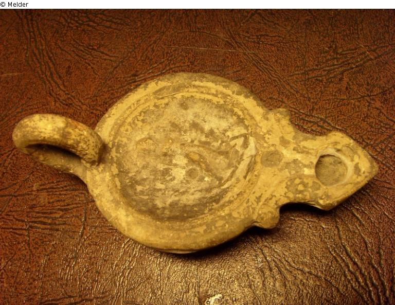 Runde Öllampe; eine Schnauze mit einem Brennloch; Schnauze annähernd drei-eckig; Verbindung von Schnauze zu Körper leicht geschwungen; zwei kurze Dornfortsätze am Übergang von Hals zu Körper; auf dem Spiegel neben der Figur kleines Bohrloch (Einfüllloch); runder Griff;