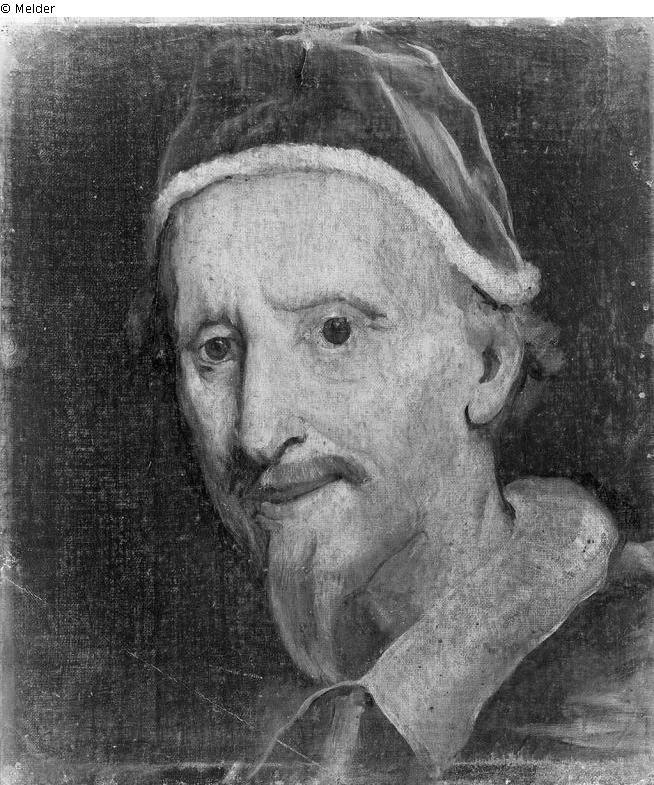 Rückseite: Auf der Holztafel mittig in Blau: "7676" [Münchner Nummer], rechts Etikett BStGS: "Inv. Nr. 13034", darüber „PR“ [Photo Roth], auf der Tafel oben und durchgestrichen noch mit Bleisift "VI", diagonal auch mit Bleistift "Schule des Velasquez IX ... Maratti", auf dem Rahmen oben in Rot "7676", daneben in Bleistift "X R 22/3°, daneben ein Zettel mit zackigem Rand darauf handschriftlich: "Ölgemälde 192", links ein abgerissener Zettel und unten links Spuren eines Aufklebers [vermutlich von einem Schaumstoffband, wie früher üblich in der Alten Pinakothek]