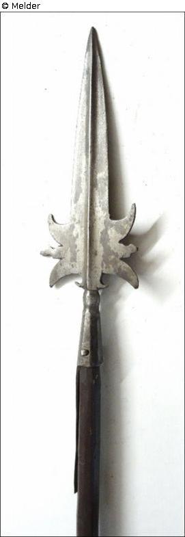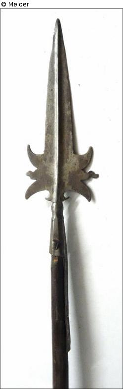 Runder Schaft, darauf mit eckiger Tülle spitz zulaufendes Klingenblatt. Dieses mit durchgehendem Nagel am Schaft befestigt. Die Mittelklinge mit beidseitig längs bis zur Spitze verlaufendem Mittelgrat. Im unteren Teil der Klinge zwei Seitenklingen in Form von horizontal gegenseitig übereinanderliegenden Halbmonden, dazwischen geflammte Zacken. Die Feder zur Befestigung der Klinge am Schaft nur fragmentarisch erhalten und an einer Seite fehlend.