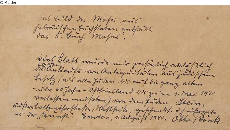 9.9.1940 – dato „Kunst“/Ostfriesisches Landesmuseum durch Schenkung von Otto Rink.