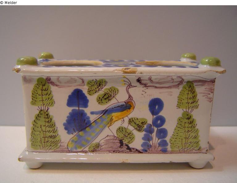 rechteckiger kastenförmiger Körper auf breiterer, rechteckiger Bodenplatte (Federablage) und gedrückten Kugelfüßen. Erhöhtes vorkragendes Gesims sowie vorkragende Deckplatte mit runden Aussparungen für Streusand- bzw. Tintengefäß, auf den Ecken halbrunde Knäufe. Bläulich-weiß glasierter, heller Scherben mit feiner Scharffeuerbemalung in Mangan, Gelb, Ocker, Blau und Grün.