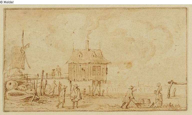 Seeufer mit Pfahlhaus und Windmühle