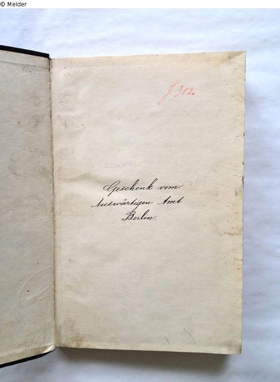 auf Vorsatzblatt: handschr. "Geschenk vom Auswärtigen Amt Berlin" [schwarze Tinte], auf Vorsatzblatt, Schmutztitel und Titelblatt: "J 302" [roter Stift, Signatur d. Kaiser-Wilhelm-Schule]