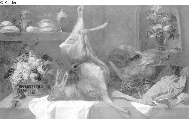 Fundmeldung | Einzelobjekt Stilleben mit totem Reh Lost Art-ID220780 Vorherige Weiter Hersteller/Künstler:in Snyders, Frans Geburt (vor) 1579.11.11, Antwerpen Tod 1657.08.19, Antwerpen WirkungsortAntwerpen, Erwähnungsland: Italien TitelStilleben mit totem RehObjektartMalereiObjektgruppeMalereiMaterial / TechnikÖl ; Leinwand / gemalt Höhe 117,00 cm Breite 194,50 cm Inventarnummermü9114Beschreibung Auf Tisch in Mitte totes Reh, oben angehängt. Rechts Krebse, links Fruchtkorb, halbrechts Eberkopf, dahinter in Nische Vase mit Blumen. Weiterlesen Weniger anzeigen Bestand Kulturgüter aus dem ehemaligen ReichsvermögenProvenienz Zugang 1938 Weiterlesen Weniger anzeigen Veröffentlicht seit2001 Kontakt Kunstverwaltung des Bundes Herbert-Bayer-Straße 5 13086 Berlin Deutschland E-Mailprovenienzforschung@kvdb.bund.deHomepagehttp://www.kunstverwaltung.bund.de
