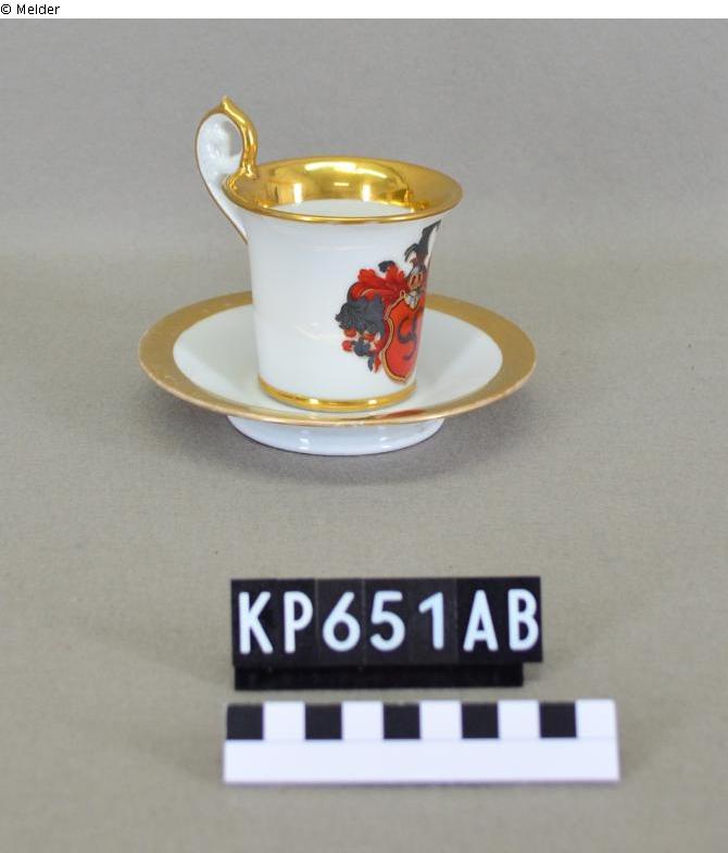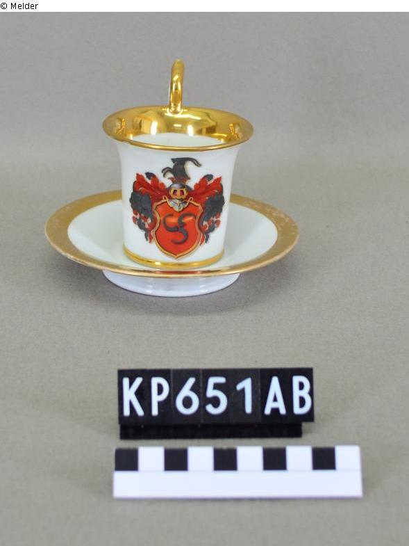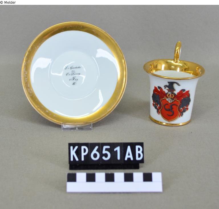 Tasse mit Wappenschild und Untertasse aus Porzellan: Tasse KP00651A: konische Form mit sich weit öffnender Mündung; randständiger Überhenkel in Ohrenform, Abschnitt oberhalb des Rand volutenartig eingerollt; Standring an der Wandung durch Wulst angedeutet; Randlippe, Mündungsbereich im Inneren, Außenseite Henkel und Wulst am Bodenumbruch vergoldet; auf der dem Henkel gegenüberliegenden Seite Darstellung eines roten Wappenschildes mit drei grauen Signalhörnern, darüber Visierhelm mit nach links gerichtetem grauen Ziegenbock als Helmzier und grauen und roten Helmdecken; Ziffer "63." als Ritzmarke im Boden. Untertasse KP00651B: Standring wulstartig; Wandung ohne erkennbaren Absatz in Fahne übergehend; waagerechte Randlippe mit breitem Goldband; auf dem Spiegel fünfzeilige Widmung "L. v. Gaudecker / s/m / O. v. Düring / 18 A. 49. / Nr! (?)"; Ziffer "63." als Pressmarke im Boden.