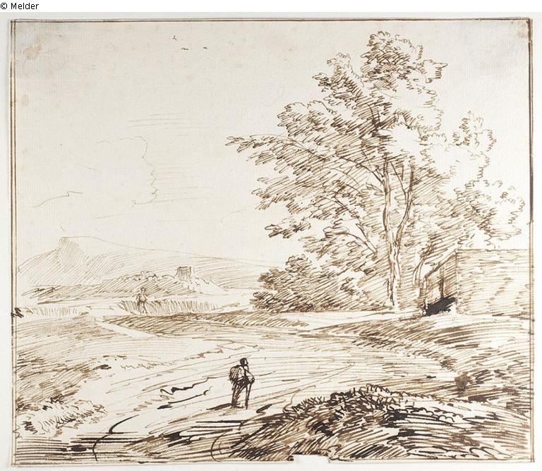 Weite bergige Landschaft mit hohen Bäumen / Südliche Landschaft mit Wanderer