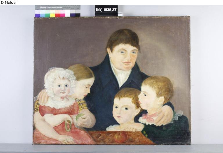 Das Gemälde zeigt einen Vater mit seinen Kindern an einem Tisch. Der Tisch bildet den unteren Rand des Gemäldes. Während der Vater zu sitzen scheint, haben seine drei größeren Kinder eng neben ihm stehend oder direkt vor ihm Platz gefunden. Das kleinste Kind sitzt vorn links im Bild auf der Tischplatte und wird von der dahinter stehenden, ältesten Tochter locker umfangen. Der älteste Sohn steht rechts im Bild. Er hat seinen Arm auf die Tischplatte gelegt und zeigt auf einen, auf dem Tisch liegenden Apfel. Die Dargestellten tragen bürgerliche Kleidung.