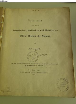 Fundmeldung Uebersicht über die im Aramäischen, Arabischen und Hebräischen übliche Bildung der Nomina Autor:in Lagarde, P. de Verlag Dieterich Objektart Buch Lost Art-ID632703