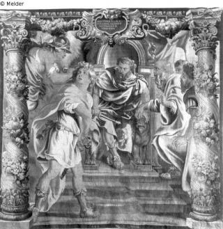Fundmeldung Die Großmut des Scipio (Scipio führt dem Alucius seine Braut zu) Hersteller/Künstler:in Leefdael, Jan van Objektart Gebrauchs- / Raumtextilie Material / TechnikTextil (Wolle) ; Textil (Seide) / BildwirkereiLost Art-ID220443