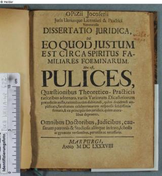 Fundmeldung Opizii Jocoserii ... Dissertatio juridica de eo quod justum est circa spiritus familiares foeminarum: hoc est Pulices Univ. Diss. Jur. Marburg Autor:in Otto Philipp Zaunschliffer Objektart Bibliotheksgut Lost Art-ID622808