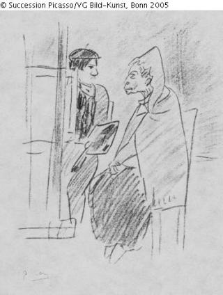 Suchmeldung Maler und Modell / Picasso beim Malen der Celestina Hersteller/Künstler:in Picasso, Pablo Objektart Zeichnung Material / TechnikKreide ; Buntstift ; Papier weiß / gezeichnetLost Art-ID305902