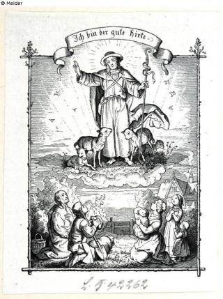 Fundmeldung Früh am Morgen Jesus gehet, ich bin der gute Hirte Hersteller/Künstler:in Richter, Ludwig (1803) Objektart Druckgrafik Material / TechnikPapier / gedruckt (Holzschnitt) ; gedruckt (Probedruck)Lost Art-ID579195