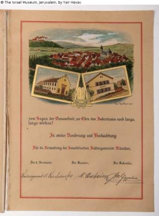 restituiert Fundmeldung Certificate of Appreciation to the legal advisor of the Jewish Community of Munich Verfasser:in Mandl, Max Objektart Archivalie Material / TechnikHandwritten in red and black ink on parchment; illustrated...Lost Art-ID573580
