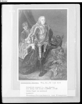 Suchmeldung Friedrich August I., der Starke im Harnisch als König von Polen Hersteller/Künstler:in Unbekannt Objektart Aquarell Material / TechnikWasserfarbe ; Papier / gezeichnet (Pinsel)Lost Art-ID583143
