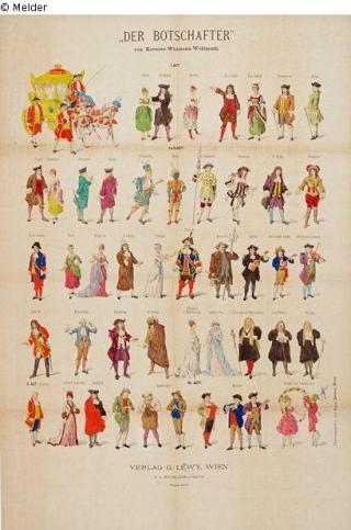 Fundmeldung Theaterfigurinen zur Oper „Der Botschafter“ Hersteller/Künstler:in Unbekannt (Herausgegeben von F. Dehner bei dem kaiserlich-königlichen Hofmusikalienverlag Gustav Lewy.) Objektart Druckgrafik Material / TechnikPapier / gedruckt (Lithographie)Lost Art-ID584286