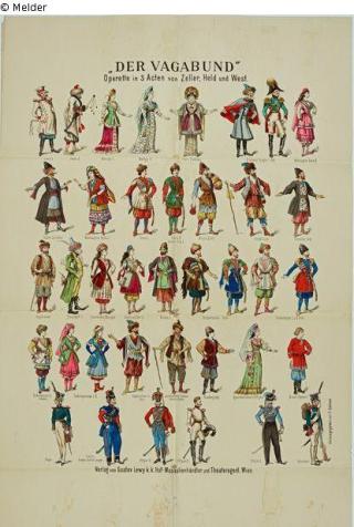 Fundmeldung Theaterfigurinen zur Operette „Der Vagabund“ Operette von Carl A. Zeller (Musik), Ludwig Held u. Moritz West (Libretto) Hersteller/Künstler:in Unbekannt (Herausgegeben von F. Dehner bei dem kaiserlich-königlichen Hofmusikalienverlag Gustav Lewy.) Objektart Druckgrafik Material / TechnikPapier / gedruckt (Lithographie)Lost Art-ID584288