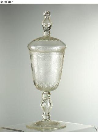 Fundmeldung Großer Deckelpokal auf den Fuldaer Abt Adolf von Dalberg Hersteller/Künstler:in Rohling: Potsdamer Glashütte; Veredelung vermutl. Berlin oder Kassel Objektart Gefäß Material / TechnikGlas / geblasen ; geformt ; geschliffen ; geschnittenLost Art-ID628772