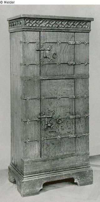 Suchmeldung Schmalschränkchen Hersteller/Künstler:in Unbekannt (Norddeutsch, Münsterland) Objektart Möbel Material / TechnikHolz (Eiche) ; Metall (Eisen) / beschlagenLost Art-ID459356