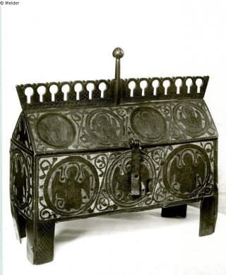 Suchmeldung Reliquienkasten mit Giebeldach / Reliquary châsse Hersteller/Künstler:in Unbekannt (Französisch, Limoges) Objektart Behältnis Material / TechnikMetall (Kupfer) ; Metall ; Emaille / vergoldet ; ChamplevéLost Art-ID589589