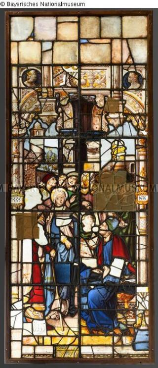 Fundmeldung Glasgemälde: Vorführung einer weiblichen Heiligen vor einem Richter Hersteller/Künstler:in Entwerfer: Coecke van Aelst, Pieter Objektart Kunsthandwerk / -gewerbe Material / TechnikGlas (Hüttenglas) silbergelb ; Schwarzlot /...Lost Art-ID582569