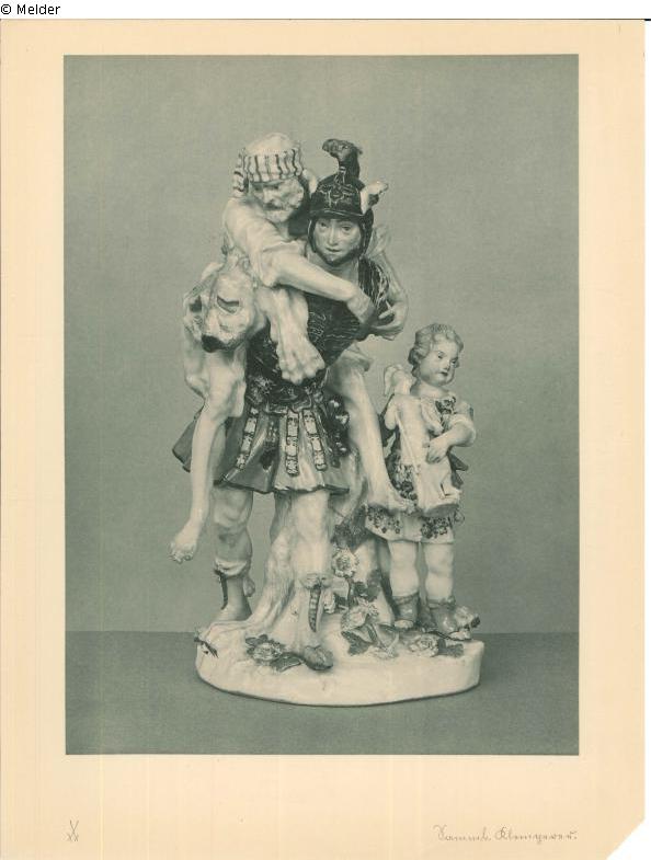 Die Figurengruppe steht auf einem unregelmäßig runden Sockel mit Blumenbelag. In dynamischer Schrittstellung, geradeaus blickend, trägt der junge Held Aeneas auf dem Rücken seinen müden Vater Anchises. Anchises hat die Armen um den Oberkörper des Aeneas gelegt, der wiederum die gewinkelten Beine des Vater fest hält. Auf dem Rücken des Aeneas liegt ein Löwenfell, dessen Haupt und eine Pranke unter dem rechten Arm des Anchises hervorschaut. Zur Linken wird Aeneas von seinem Sohn Askanios begleitet, der mit beiden Armen die Statue der Minerva mit Medusenschild, Lanze und Federbuschhelm trägt. Hinter den Figuren ein Baumstumpf, der als Brennhilfe diente. Aeneas trägt einen Helm mit Federbusch, einen römischen Brustpanzer und einen kurzen Rock. An den Füßen hat er Stiefel, die die Zehen frei lassen. Der bärtige Anchisis ist in ein weißes, locker fallenes Kleid gehüllt, um den Kopf ist ein gestreiftes Tuch gewickelt. Der Knabe trägt ein kurzes, geblümtes Kleid. Sein helles Haar liegt in Wellen am Kopf. Die Füße stecken ebenfalls in Stiefeln, die die Zehen frei lassen. Modell: Johann Joachim Kaendler zugeschrieben.