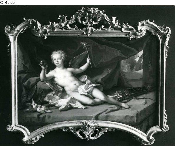 Titel alternativ: Liegender Amor mit Liebesapfel und Fackel. Der dazugehörige Rahmen im Berliner Schloss verbrannt.