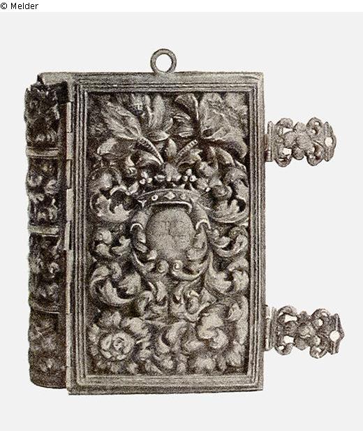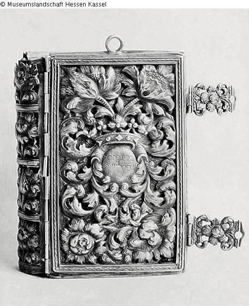 Amsterdamer Brauttefiloh mit reich in Blattwerk und Blumen getriebenem Silbereinband mit Aufhängeröse und Schließen, Gebetbuch 5477/1712. Einband auf beiden Seiten in der Mitte in getriebenem Medaillon mit Krone hebräische Namensinschriften.